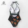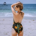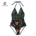Best Offer CUPSHE Green and Black Floral Halter One-Piece Swimsuit Women Sexy V-neck Backless Monokini 2020 Be with Free Shipping Worldwide!